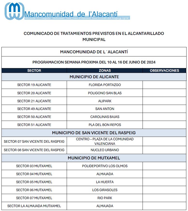 Calendario de tratamiento de plagas del 3 al 9 de junio de 2024