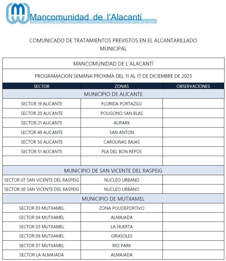 Calendario de tratamiento de plagas del 4 al 10 de diciembre de 2023