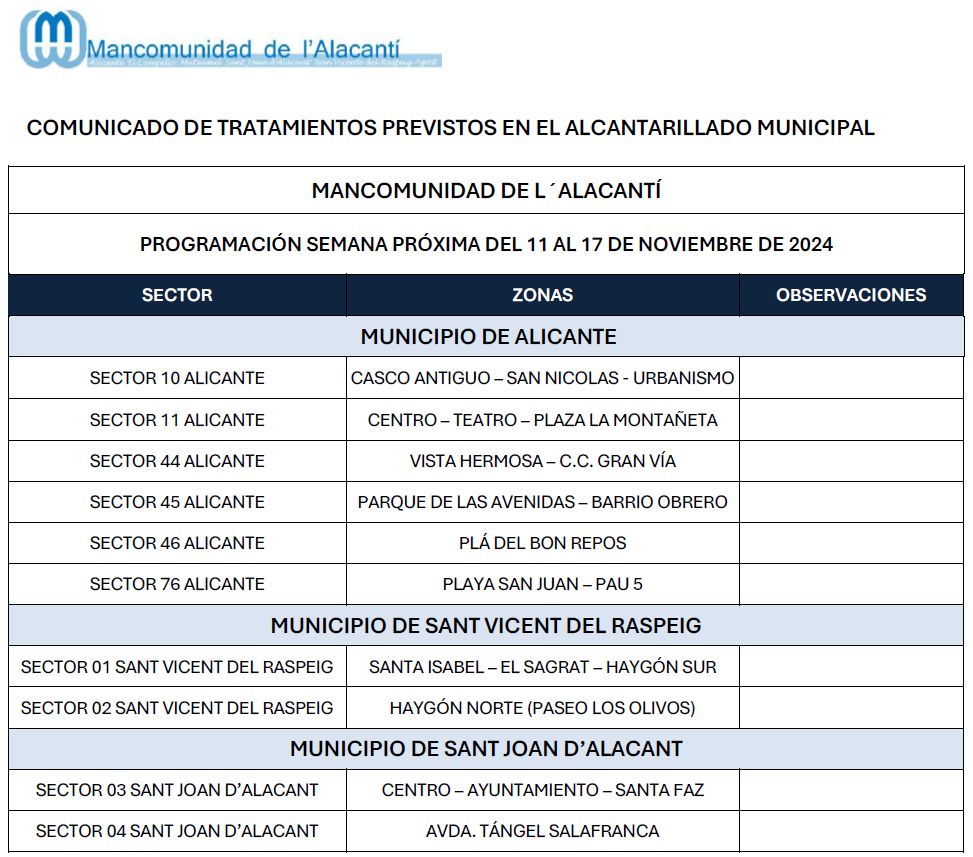 Calendario de tratamiento de plagas del 18 al 24 de noviembre de 2024