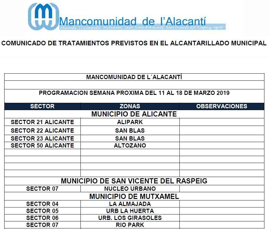 Calendario de tratamiento de plagas del 19 al 26 de marzo de 2019