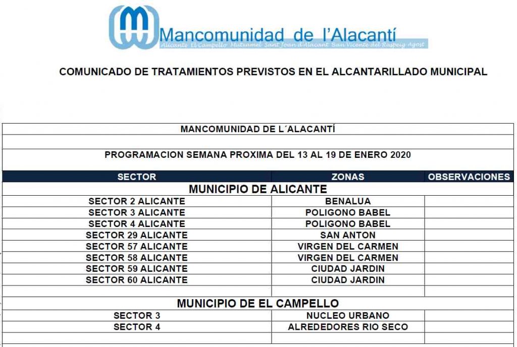 Calendario de tratamiento de plagas del 20 al 26 de enero de 2020