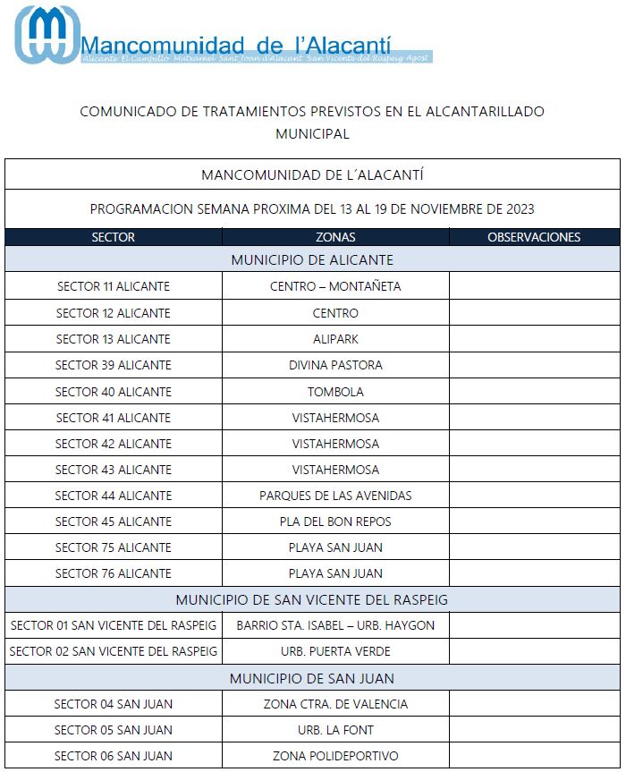 Calendario de tratamiento de plagas del 20 al 26 de noviembre de 2023