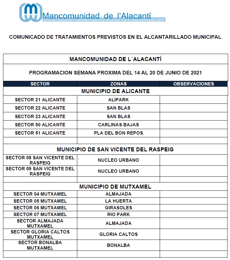 Calendario de tratamiento de plagas del 21 al 27 de junio de 2021