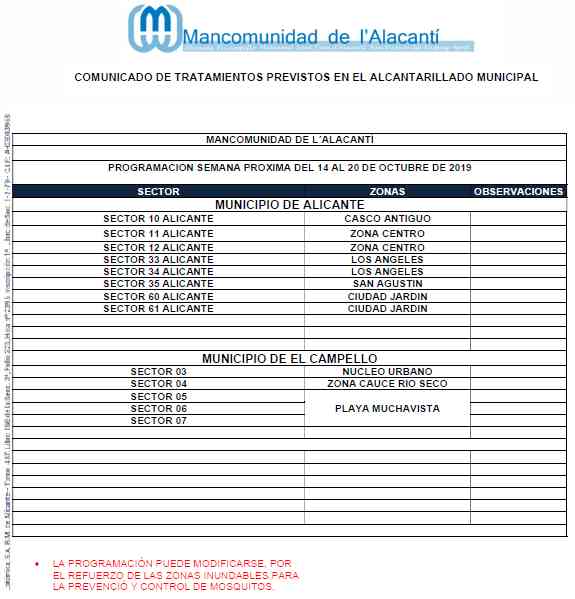 Calendario de tratamiento de plagas del 21 al 27 de octubre de 2019