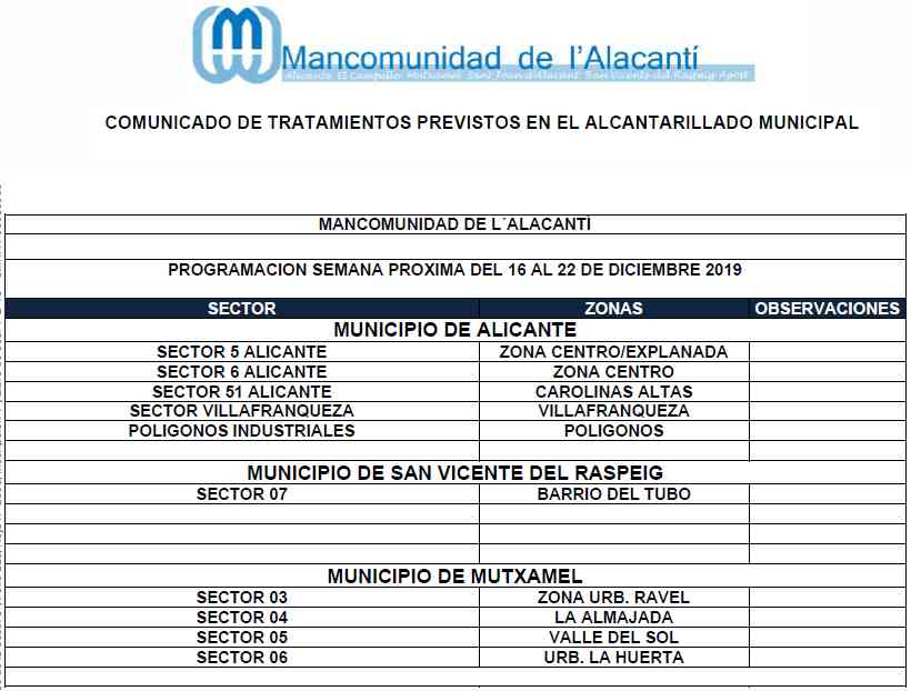 Calendario de tratamiento de plagas del 9 al 15 de diciembre de 2019