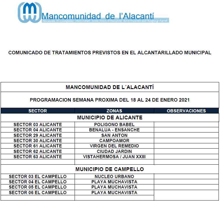 Calendario de tratamiento de plagas del 11 al 17 de enero de 2021