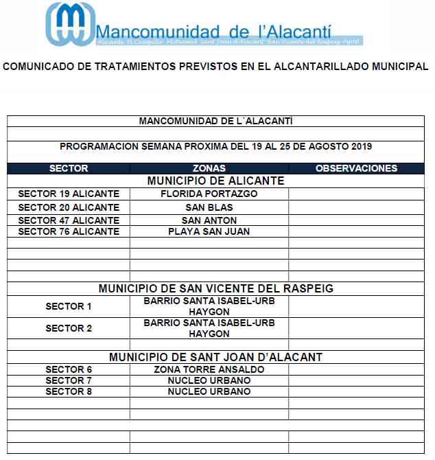 Calendario de tratamiento de plagas del 26 de agosto al 1 de septiembre de 2019