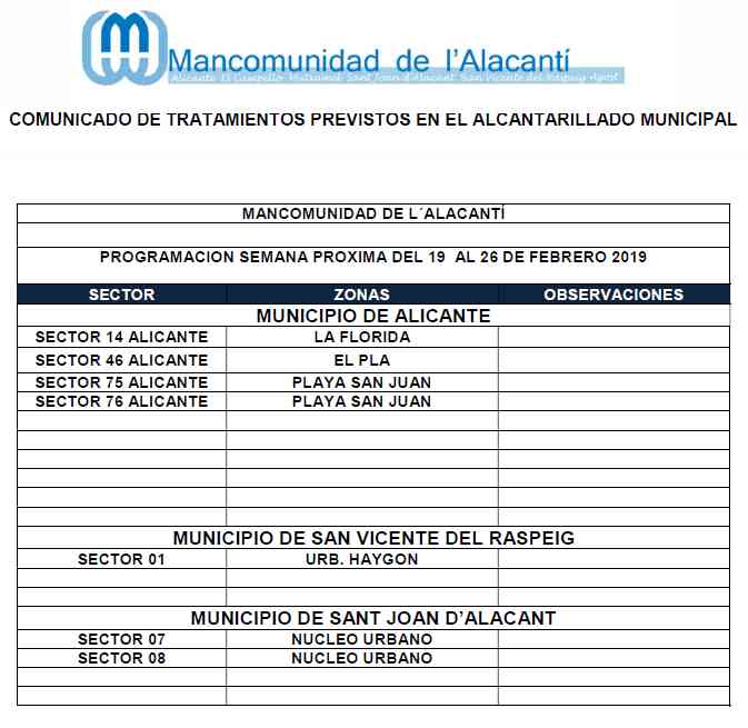 Calendario de tratamiento de plagas del 12 al 19 de febrero de 2019