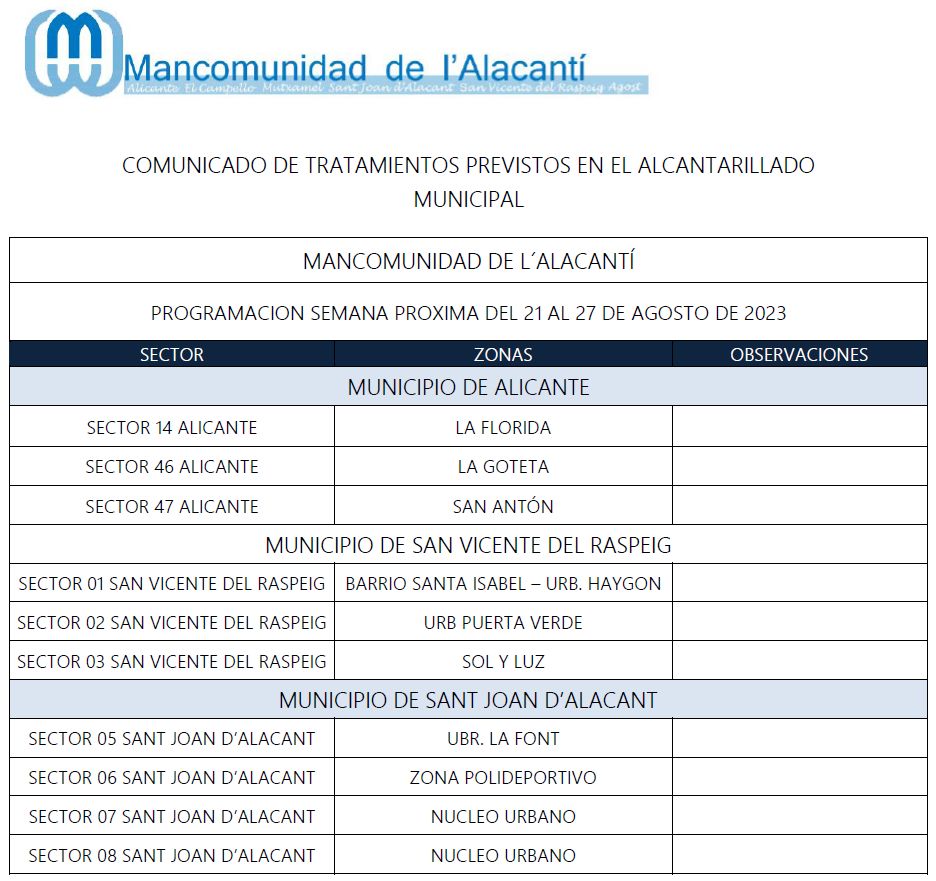 Calendario de tratamiento de plagas del 28 de agosto al 3 de septiembre de 2023