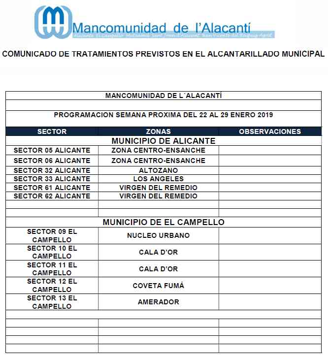 Calendario de tratamiento de plagas del 15 al 22 de enero de 2019