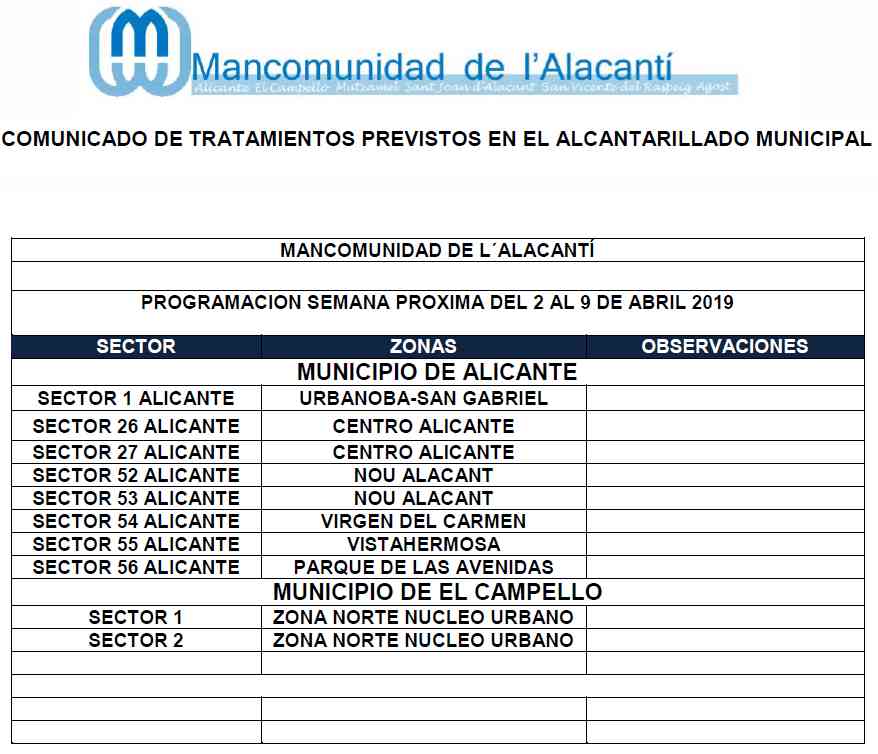 Calendario de tratamiento de plagas del 26 de marzo al 2 de abril de 2019