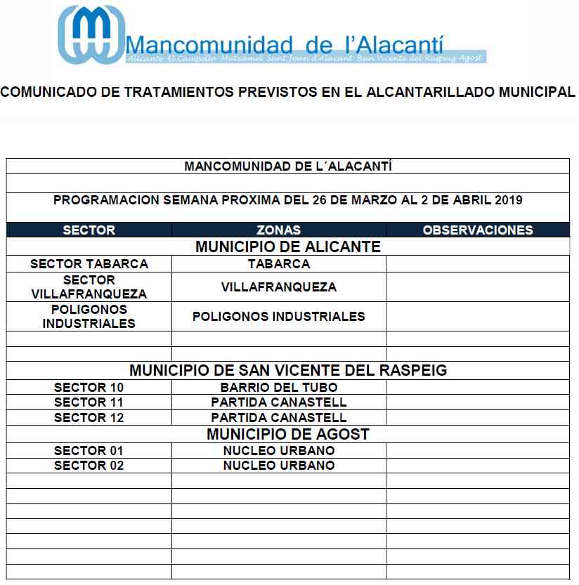 Calendario de tratamiento de plagas del 19 al 26 de marzo de 2019