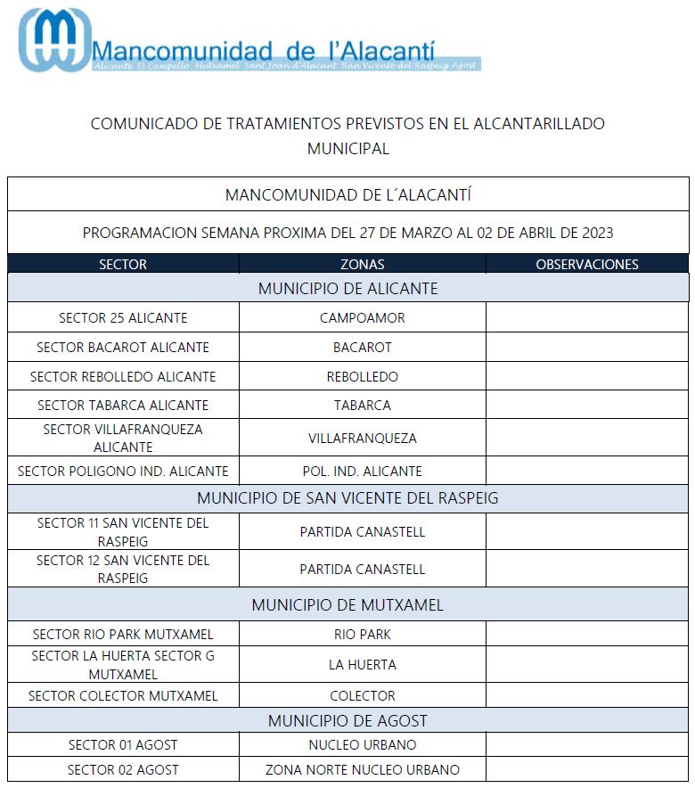 Calendario de tratamiento de plagas del 20 al 26 de marzo de 2023