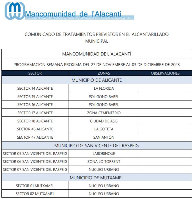 Calendario de tratamiento de plagas del 27 de noviembre al 3 de diciembre de 2023
