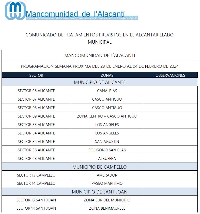 Calendario de tratamiento de plagas del 22 al 28 de enero de 2024