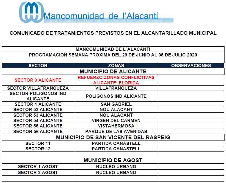 Calendario de tratamiento de plagas del 22 al 28 de junio de 2020