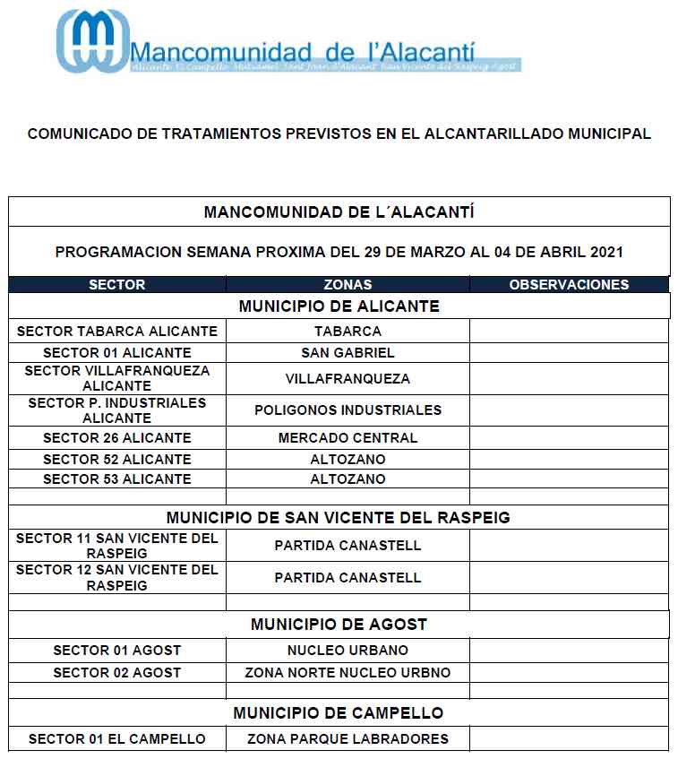 Calendario de tratamiento de plagas del 22 al 28 de marzo de 2021
