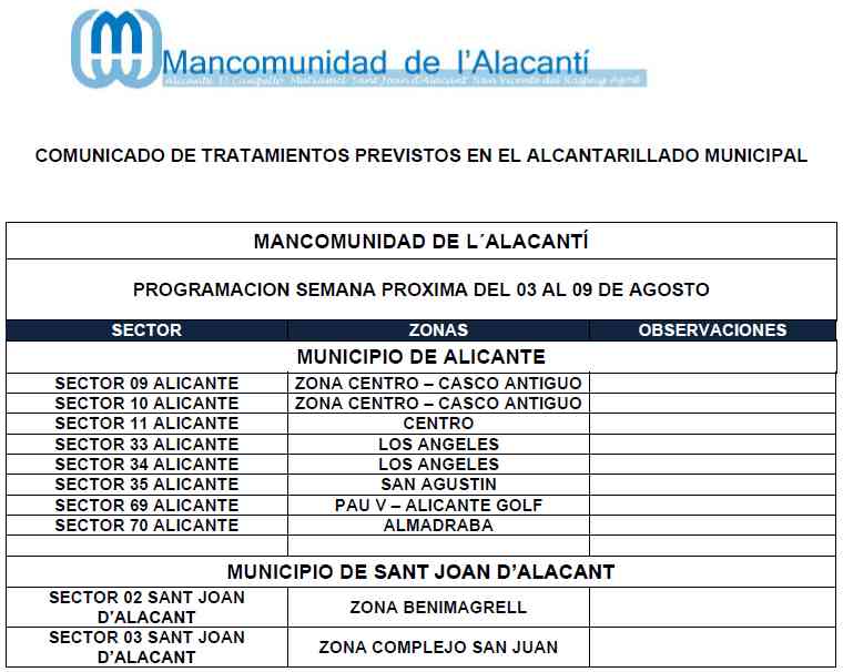Calendario de tratamiento de plagas del 27 de julio al 2 de agosto de 2020