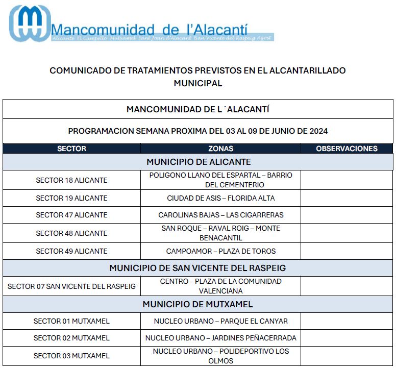 Calendario de tratamiento de plagas del 27 de mayo al 2 de junio de 2024