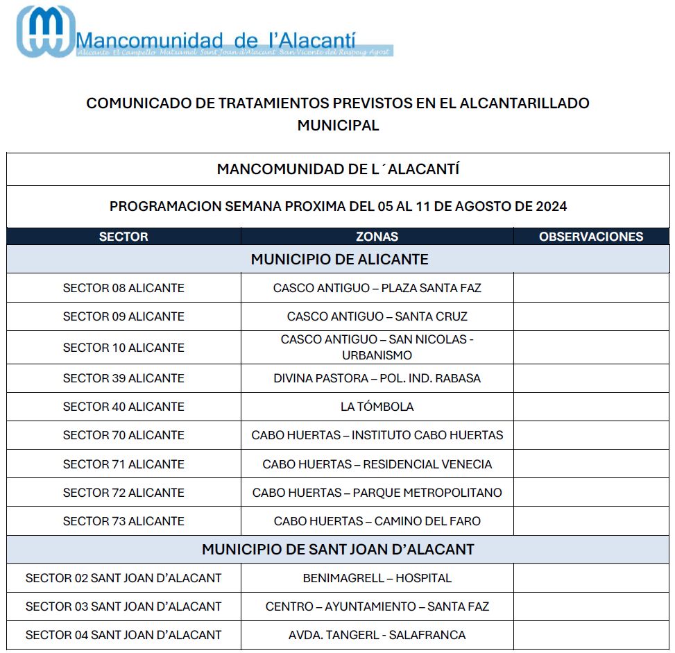 Calendario de tratamiento de plagas del 5 al 11 de agosto de 2024