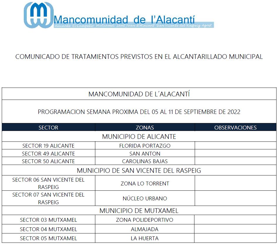 Calendario de tratamiento de plagas del 5 al 11 de septiembre de 2022