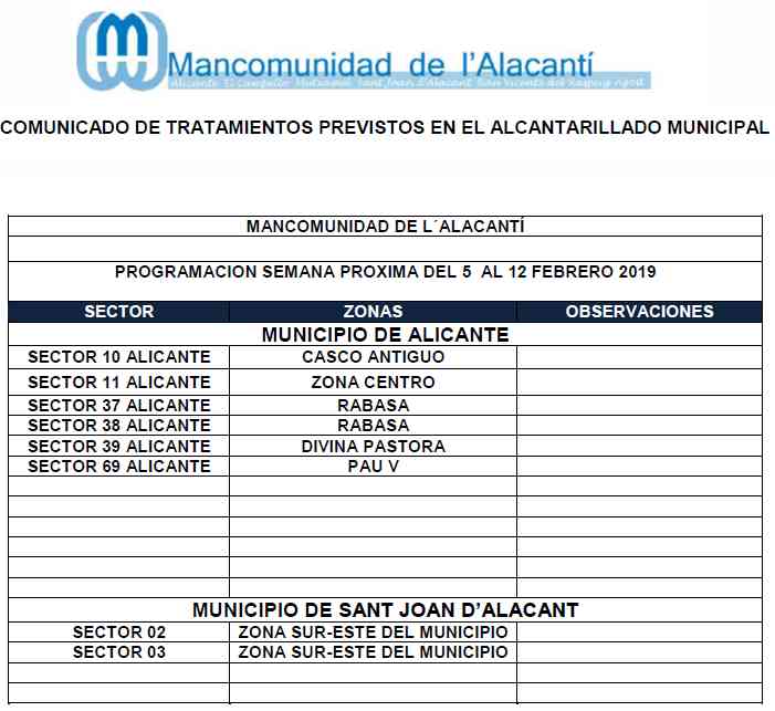 Calendario de tratamiento de plagas del 5 al 12 de febrero de 2019