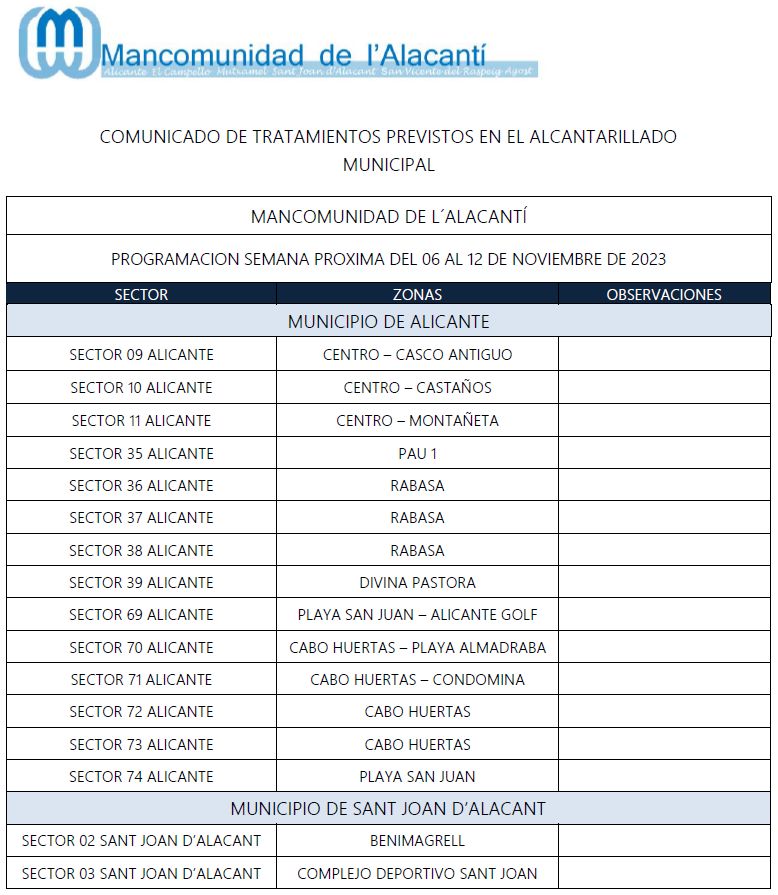 Calendario de tratamiento de plagas del 13 al 19 de noviembre de 2023