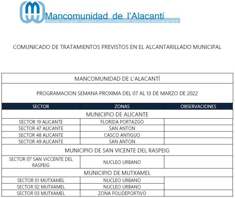 Calendario de tratamiento de plagas del 7 al 13 de marzo de 2022